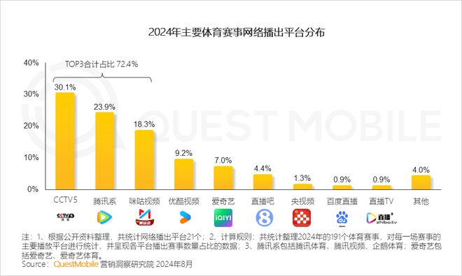 QuestMobile数据显示,巴黎奥运会触达用户规模达6.35亿,深度触达用户占比21.3%;体育赛事网络播出平台上,CCTV5、腾讯系、咪咕视频三强格局形成,分别占据30.1%、23.9%、18.3%的市场份额。 其中,视...