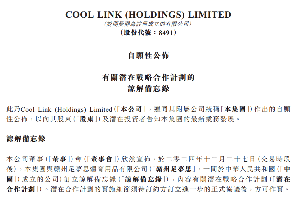 2024年12月27日晚间消息,Cool Link (Holdings) Limited(HK:08491,以下简称“Cool Link”)宣布,已与赣州足梦思体育用品有限公司(以下简称“赣州足梦思”)订立了一份谅解备忘录,内容有关潜在战...